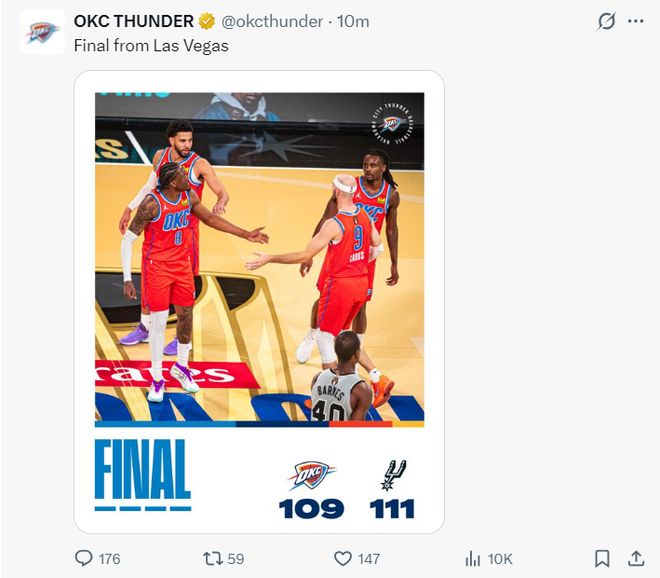 北京时间12月14日,NBA杯半决赛,雷霆109-111被马刺逆转,雷霆无缘决赛,雷霆16连胜也被马刺终结。这场比雷霆一度领先马刺16分之多,没想到在末节被逆转了,联盟第一的雷霆此役是全主力出战,马刺的文班亚马复出雷霆全主力就挡不住了?